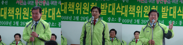 이날 박병석 대전시당위원장은 "통합민주당이야말로 서민과 중산층을 위한 유일한 민생정당"이라며 한나라당은 원칙과 소신이없는 후보를 낸 정당도 있다고 비판했다.