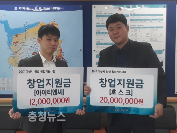 충남 아산시(시장 복기왕)는 지난 22일 2017 청년 창업지원 사업으로 선정된 2팀의 청년창업가에게 청년창업지원금을 전달했다.