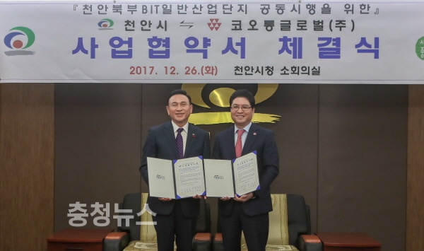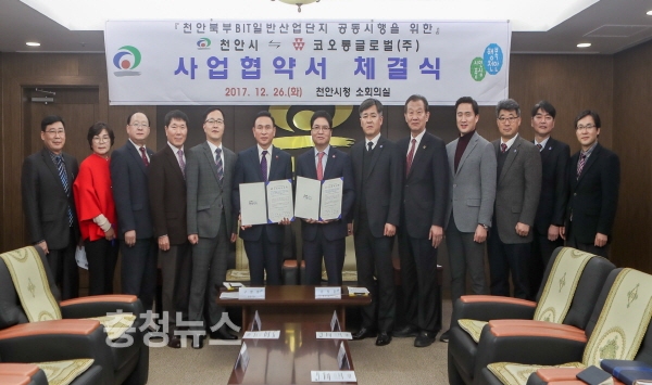 시는 코오롱글로벌㈜와 26일 시청 소회의실에서 ‘천안 북부 BIT일반산업단지 조성사업’을 위한 공동사업추진협약을 체결했다.