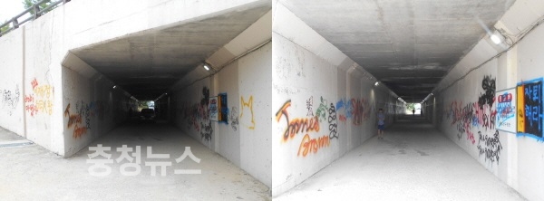 대전 유성구(구청장 허태정)가 어둡고 지저분한 낙서로 통행에 불안감을 주던 궁동2교 통로박스를 벽화조성사업을 통해 밝은 감성으로 재탄생시켰다.