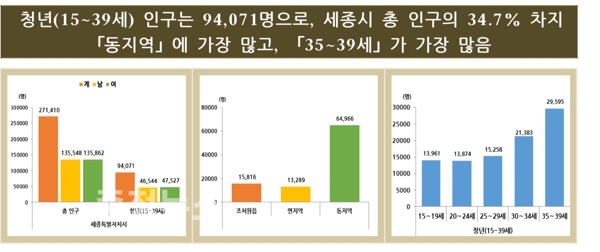 세종시 청년(만 15~39세) 인구는 9만4,071명으로 세종시 총 인구의 34.7%를 차지하고 있으며, 혼인상태는 ‘미혼’이 더 많았고, 초혼연령은 남성은 ‘30~34세’, 여성은 ‘25~29세’가 가장 많았다.