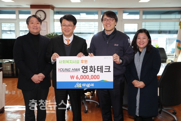 자동차 전장부품을 설계, 개발, 생산하는 자동차부품 전문기업인 영화테크(대표 엄준형)가 27일 관내 사회복지시설 지원금으로 사용해 달라며 600만원을아산시(시장 복기왕)에 기탁했다.