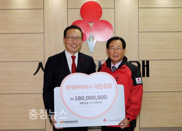 한국타이어(대표이사 서승화)는 27일 대전시 서구 대전사회복지공동모금회에서 안기호 사회복지공동모금회장, 이기영 한국타이어 대전공장장 및  관계자들이 참석한 가운데 희망성금 1억 8천만원을 전달했다.