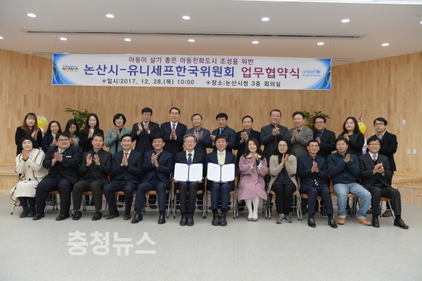 논산시(시장 황명선)와 유니세프한국위원회(사무총장 서대원)는 28일 회의실에서 기관·단체장, 아동친화도시 추진위원, 아동 등 70여명이 참석한 가운데 업무 협약을 체결했다.