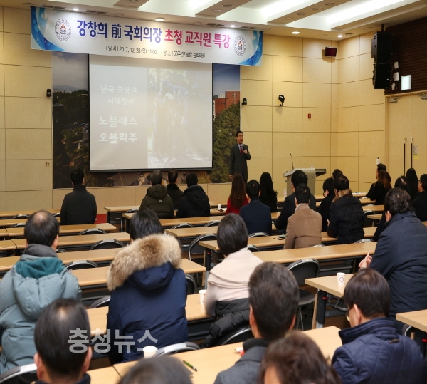2016년부터 한남대 석좌교수를 맡고 있는 강 전 국회의장은 이날 ‘난국 해결의 시대정신-노블레스 오블리주’라는 주제로 전체 직원들에게 1시간 동안 강연을 했다.