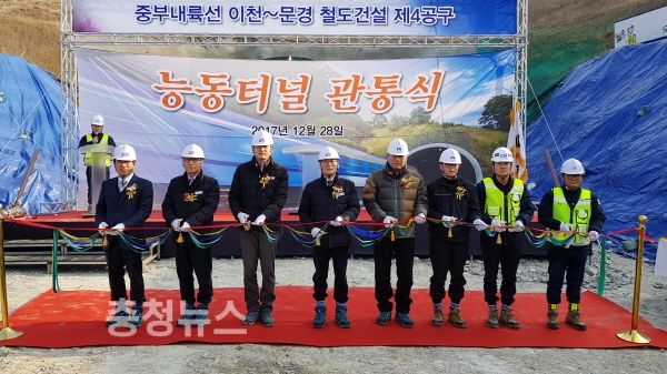 한국철도시설공단 충청본부(본부장 이동렬)는 중부내륙선(이천∼충주∼문경) 철도건설 제4공구 공사구간 중 가장 난(難)공사인 능동터널(3.365km)을 지난 28일 관통했다고 밝혔다.