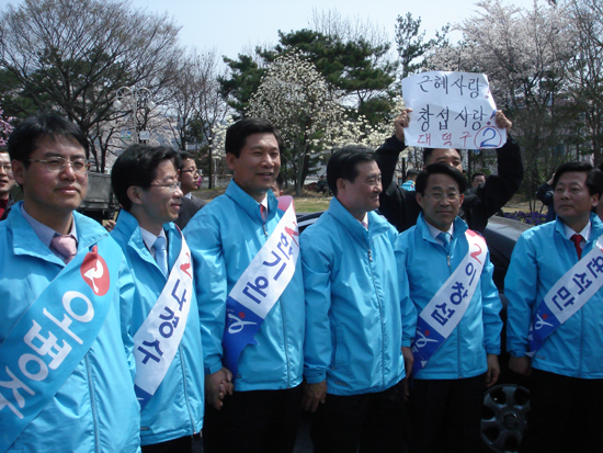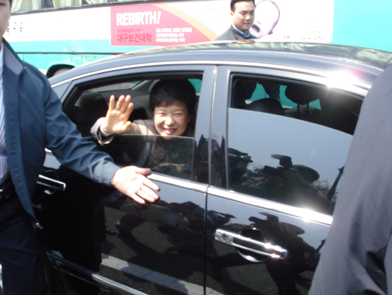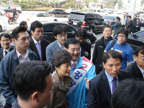 박 전대표는 친박연대 이영규 후보와 금산에 출마하는 심정수 후보 선거운동원 등이 대거몰려와 강창희 선거사무소 앞에서 박근혜 전대표를 연호한는 등 몸싸움 사태로 긴장 국면을 연출하는 등 취재진들의 관심을 끌었다.
