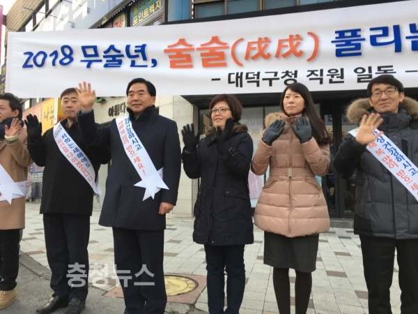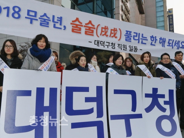 대전 대덕구(구청장 박수범)는 2일 하나로네거리 등 주요 교차로 4곳에서 구청 직원들이 아침 일찍 거리로 나와 주민들에게 인사하며 무술년 새해 첫 업무를 시작했다.