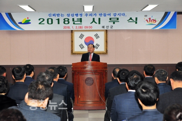 충남 예산군은 2일 군청 제1회의실에서 2018년도 시무식을 갖고 새해를 희망차게 시작했다.