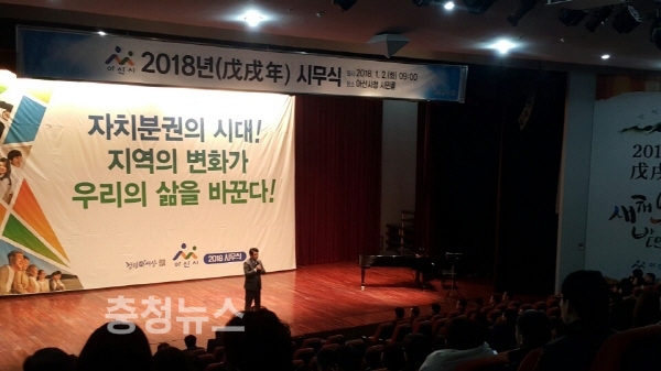 충남 아산시(시장 복기왕)는 2일 시청 시민홀에서 2018년 무술년 새해 힘찬 출발을 다짐하는 시무식을 가졌다.