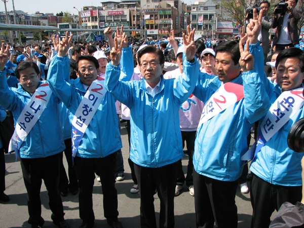 강 대표는선거를 하루 앞둔 8일 오전 대전역 지원유세에서 "대전ㆍ충청도 시ㆍ도지사 모두가 한나라당 이다". "이번에 국회의원만 만들어 주면 모두 한나라당이여야 진정한 정권교체가 이뤄진 것 " 이라면서 지지를 호소했다.
