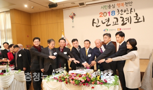 천안시와 ㈜티브로드 중부방송이 공동으로 주최하는 이번 신년교례회는 구본영 시장을 비롯해 국회의원, 기관단체장, 지역인사 등 300여명이 참석해 천안시의 발전을 기원했다.