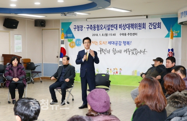 허태정 대전 유성구청장이 8일 오후 구즉동주민센터에서 열린 구즉동 혐오시설 반대 비상대책위원회 간담회에 참석해 구즉동 현안사업의 심각성에 깊이 공감했다.