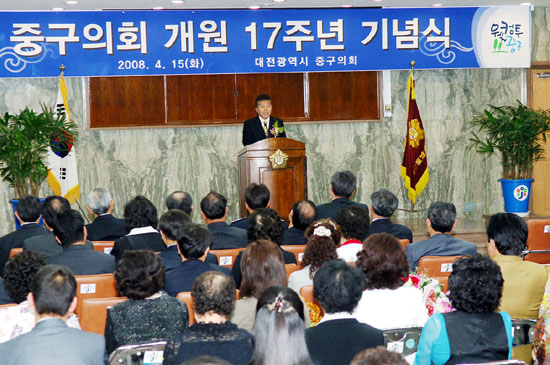 중구의회(의장 이운우)는 2008. 4. 15(화) 14시 30분부터 제5대 의회 개원 전반기 마무리하는 중구의회 개원 제17주년 기념행사를 개최하였고, 이 자리에서 우리지역과 의정 발전을 위해 헌신하신 구민과 공무원등 37명에게 표창패를 전수했다.