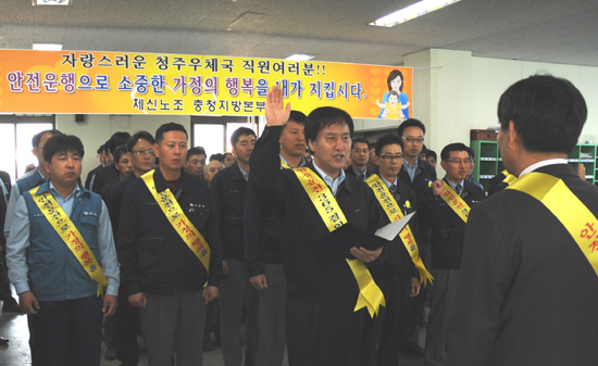 충청체신청(청장 이계순)에 따르면 체신노조 충청지방본부가 직접 나서 우리직원들의 안전을 스스로 지키고 나아가 조합원 가족들의 행복을 지키기 위해 안전운전 캠페인을 벌이고 있다.