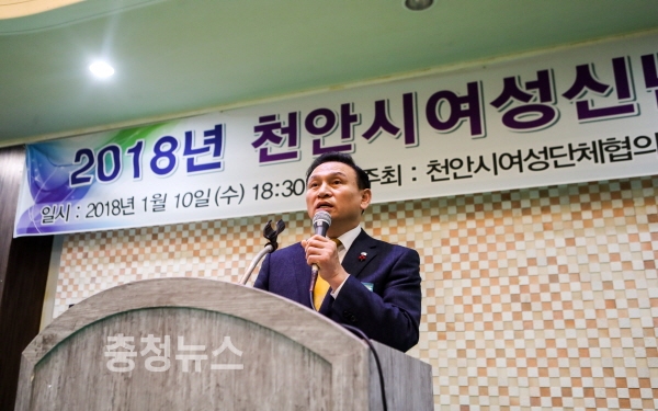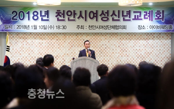 천안여성신년교례회에서 구본영시장 인사말 모습