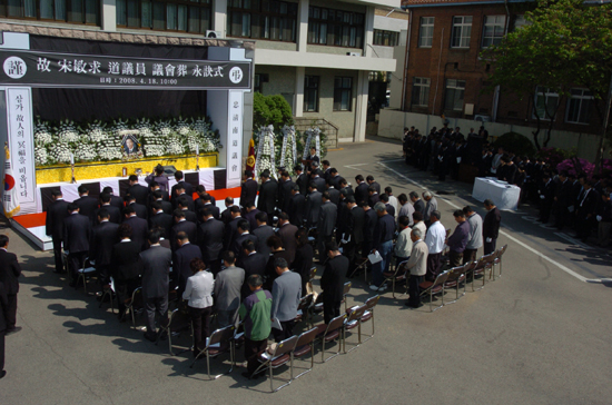故 송민구 도의원 의회장 영결식이 18일 오전 10시 충청남도의회 앞마당에서 김문규 도의회의장, 이완구도지사, 오제직교육감, 도의원, 도단위 기관․단체장 등 200여명이 참석한 가운데 거행되었다.