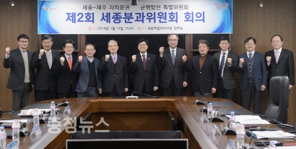 세종특별자치시(시장 이춘희)는 12일 청사 내 집현실에서 이춘희 시장과 안성호 세종분과위원장 등 분과위원들이 참석한 가운데 세종시 자치분권과 균형발전 모델 완성을 위한 ‘세종·제주 자치분권 균형발전 특별위원회 제2회 세종분과위원회 회의’를 가졌다.