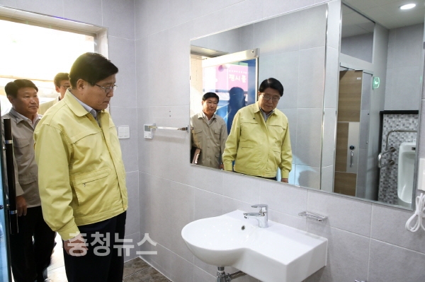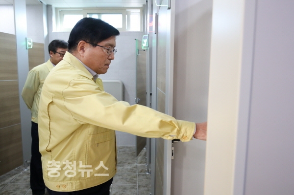 공중화장실을 점검 중인 한상기 태안군수(2017. 6.).