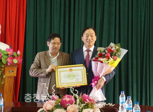 다크롱시 시장 레닥쿠이(Le Dac Quy)가 설동호 교육감(오른쪽)에 다크롱지역개발위원회 감사장을 전달했다.