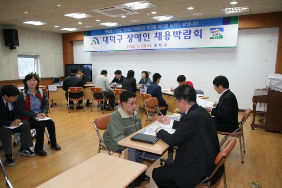 대전시 대덕구(구청장 정용기)는 지난 23일 연축동 소재 대덕구장애인종합복지관 3층 강당에서 관내 21개 사업체 및 장애인 300여명이 참여한 가운데 ‘대덕구 장애인 채용박람회’를 성황리에 개최하였다고 밝혔다.