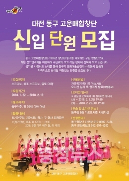 대전 동구(구청장 한현택)는 고운 선율로 지역 문화예술 발전과 사회봉사 활동에 참여할 고운매합창단 신입단원을 다음달 19일까지 모집한다.