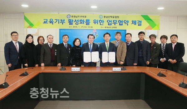 충남교육청(교육감 김지철)은 17일 도교육청 정책협의실에서 충남산학융합원(원장 김홍)과 교육기부 활성화를 위한 업무협약을 체결했다.