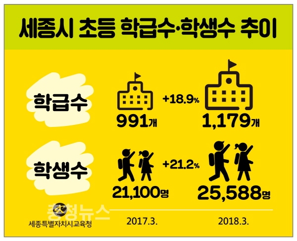 학급 배정에 기준이 되는 올해 초등학생 수는 지난해 21,100명보다 4,488명, 21.2% 증가한 25,588명이다. 이는 2012년 세종시 출범 이후 922학급, 20,000여 명이 늘어난 수치다.