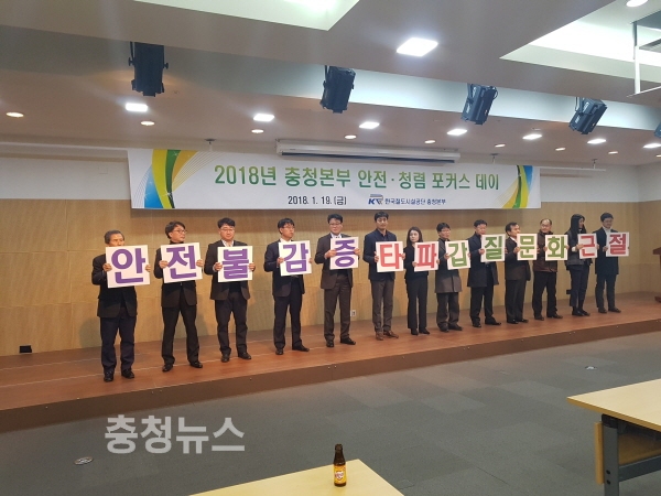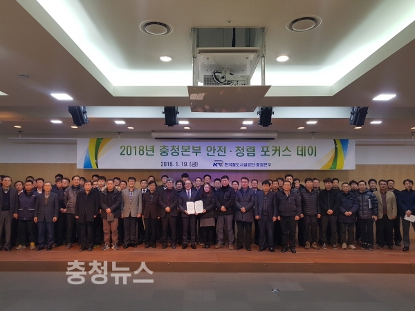 한국철도시설공단 충청본부(본부장 이동렬)는 충청본부와 협력사 직원 등 약 200여 명이 참석한 가운데 ’18년 무재해·무사고 달성과 청렴한 본부를 만들기 위해 ‘안전/청렴 포커스데이’ 행사를 19일 본사 3층 대회의실에서 개최했다고 밝혔다.