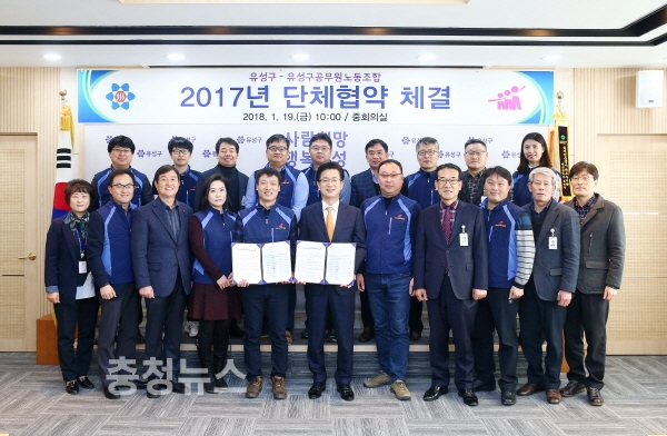 대전 유성구(구청장 허태정)는 19일 구청 중회의실에서 유성구공무원노동조합(위원장 한재성)과 노사관계자 등 20여명이 참석한 가운데 단체협약을 체결했다고 밝혔다.