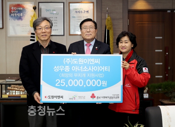 충남 태안군에 따르면, ㈜도원이엔씨(대표 성우종)는 19일 군청 군수실에서 한상기 군수와 성우종 대표 및 아동복지시설 관계자 등이 참석한 가운데 성금 기탁식을 갖고 성금 2500만 원을 군에 기탁했다.