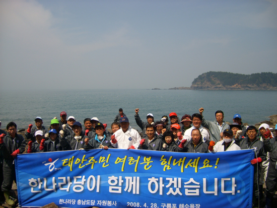한나라당 충남도당(이진구위원장)은 4월 28일(월) 10시부터~오후 3시까지 태안군 소원면 의항리 산67번지 구름포해수욕장에서 서해안 기름유출로 인해 여전히 슬픔에 빠져있는 어려운 이웃과 함께하고자 방제작업 봉사활동을 실시했다.