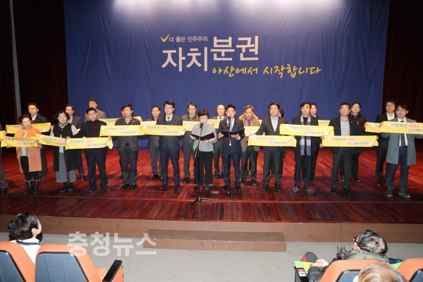 충남 아산시(시장 복기왕)는 지난 19일 아산시청 시민홀에서 복기왕 아산시장과 사회단체 대표, 시민 등 시민홀을 가득 메운 가운데, 지방분권개헌 아산회의 출범식을 열고, 지방분권개헌을 위한 활동 계획을 알렸다.