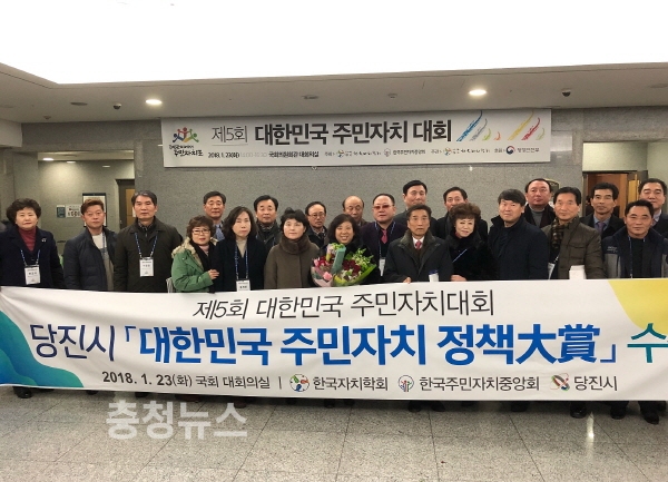 충남 당진형 주민자치가 23일 열린 제5회 대한민국 주민자치대회(주최 국회 이주영, 유성엽, 이학재, 김두권 의원실, 사단법인 한국자치학회, 한국주민자치 중앙회)에서 시군구 정책분야 대상을 수상했다.