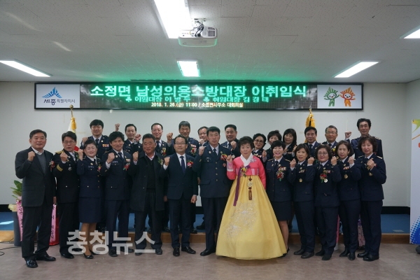 세종시(시장 이춘희) 조치원소방서는 26일 소정면사무소에서 강준현 정무부시장과 소방공무원, 의용소방대원 등 90여명이 참석한 가운데 소정면 남성의용소방대장 이·취임식을 가졌다.