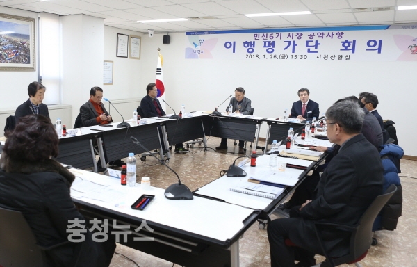 충남 보령시는 26일 오후 시청 상황실에서 김동일 시장과 이행평가단이 참석한 가운데 민선6기 공약사업 평가를 위한 이행평가단 회의를 가졌다.