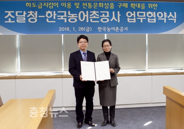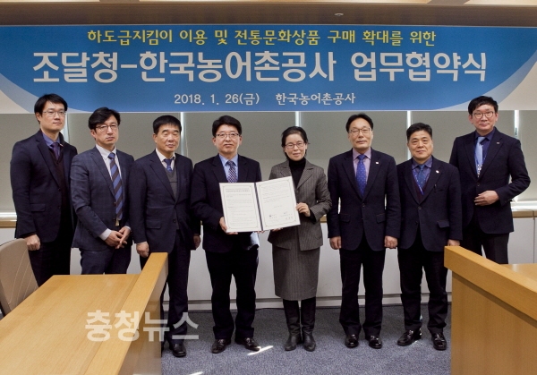 한국농어촌공사는 26일 전남 나주 본사에서 조달청과 ‘하도급지킴이 이용 및 전통문화상품 구매확대에 관한 업무협약(MOU)’을 체결했다.