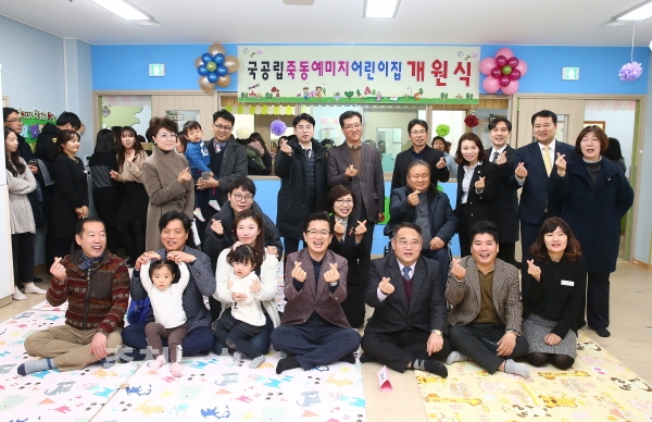 대전 유성구(구청장 허태정)가 지난 27일 양질의 공보육 서비스 제공을 위해 여섯 번째 국공립 어린이집인 죽동예미지 어린이집의 본격적인 운영을 위한 개원식을 개최한 가운데, 주요내빈과 학부모들이 기념촬영을 하고 있다.