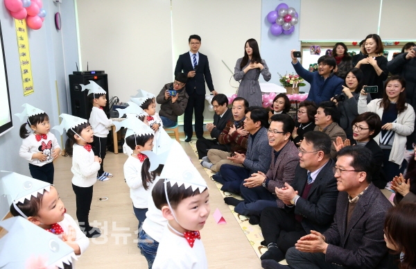 양질의 공보육 서비스 제공을 위해 여섯 번째 국공립 어린이집인 죽동예미지 어린이집의 개원식을 개최한 가운데, 어린이들의 귀여운 율동이 펼쳐지고 있다.