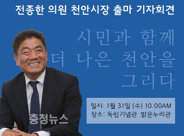 '시민과 함께 더 나은 천안을 그리다'라는 슬로건 아래 열리는 출마 기자회견에서 전종한 천안시의회 의장은 '시민 여러분에게 드리는 글‘과 ’민주당원 여러분에게 드리는 글'을 각각 발표한다.