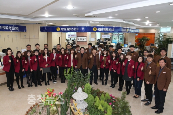 충남 청양군의 얼굴인 민원봉사실 직원들이 새 민원복으로 갈아입고 군민이 만족하는 ‘군민행복 민원실’ 운영을 위해 미소와 친절로 민원인을 맞이하고 있다.