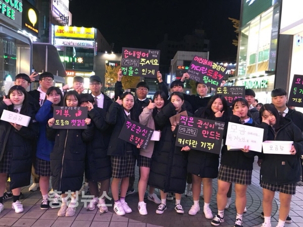 연무고등학교 봉사동아리 ‘돋보기’ 회원 25명은 대전 으능정이 거리에서 모금 행사를 펼쳐, 성금으로 떡국떡을 구입해 관내 어려운 이웃에게 전달하며 나눔의 기쁨을 실천했다.