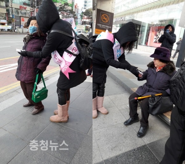 시내버스 안내도우미 핫팩 나눠드리는 모습