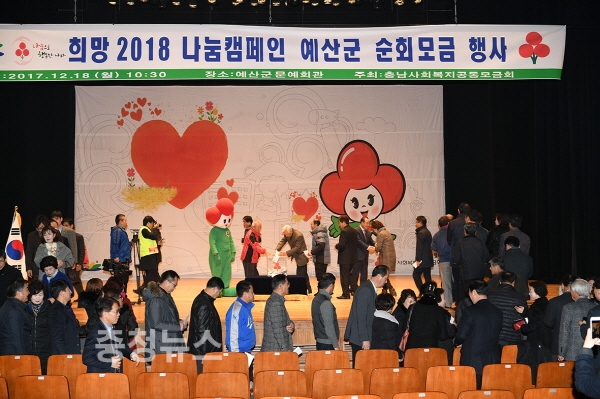 충남 예산군민의 이웃사랑은 매서운 한파도 막을 수 없이 뜨거웠다. 충남 예산군이 충남사회복지공동모금회와 공동으로 지난해 11월 20일부터 73일간 진행한 ‘희망 2018 나눔 캠페인’이 집중모금기간(17.11.20.∼18.1.31.)에 목표액을 초과달성하며 성황리에 막을 내렸다.