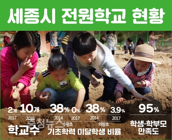 세종시교육청(교육감 최교진)은 지금까지의 농촌 전원학교 운영 성과를 바탕으로, 2018학년도에는 대상학교를 면지역에 있는 학생 수 100명 이하의 소규모 초‧중학교 10개교 전체로 확대한다고 31일 밝혔다.