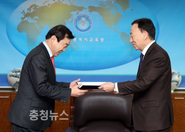 설동호 교육감(오른쪽)이 이창구 원장에게 표창을 전달하고 있다.