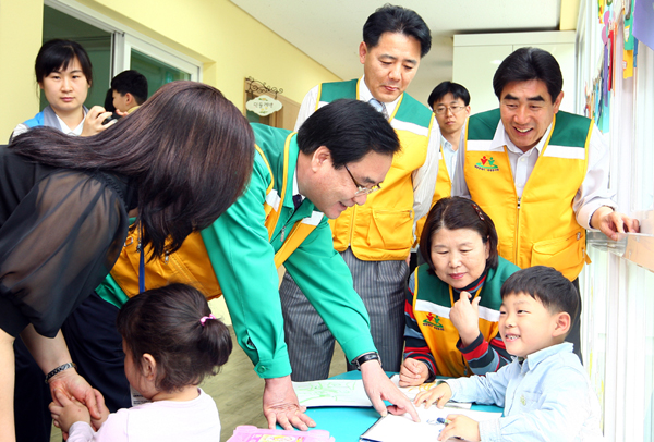 ▲김영관의장을 비롯한 시의원들이 영유아장애인시설에서 어린이들과 대화를 나누고 있다.(사진 좌측 김영관의장, 김재경의원, 이정희의원, 김학원교육사회 위원장)