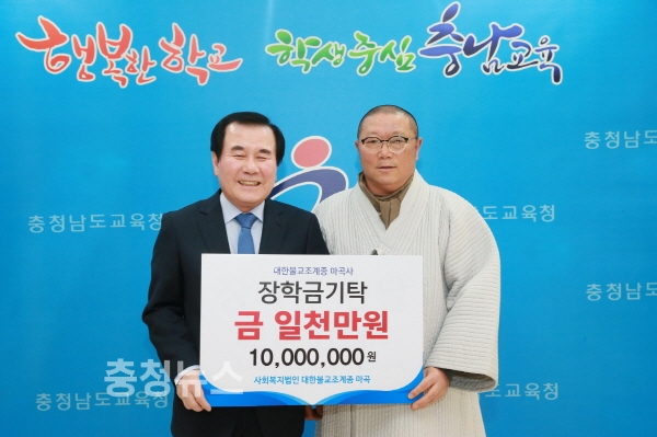 충남교육청(교육감 김지철)은 1일 대한불교조계종 마곡사(주지 원경 스님)로부터 장학금 1000만 원을 전달받았다.