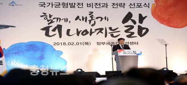 문재인 대통령은 1일 정부세종컨벤션센터에서 열린 국가균형발전 비전 선포식에서 “세종시에 올 때마다 마음 뿌듯하고 기쁘며, 세종시에는 국가균형발전의 꿈이 담겨있다”며 “세종시가 발전하는 모습은 곧 국가균형발전의 희망이다”고 밝혔다.