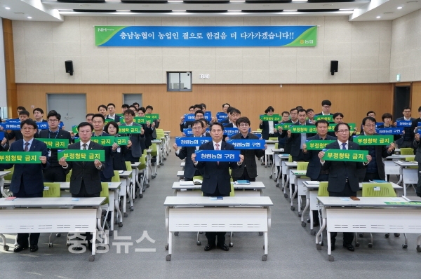 농협 충남지역본부(본부장 조소행)는 2일 충남 홍성군 내포신도시에 위치한 충남본부 대회의실에서 150여명이 참석한 가운데 임직원 행동강령 준수와 청렴한 농협인으로 거듭나기 위한 윤리경영 실천 결의대회를 개최했다.